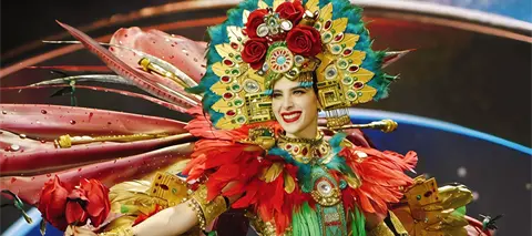 México mostró la creación del diseñador Fernando Ortiz, donde resaltaban colores como el rojo, amarillo y esmeralda, con un penacho gigante y detalles como plumas y rosas gigantes.