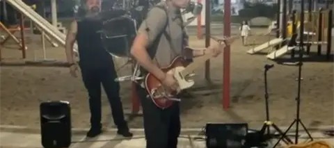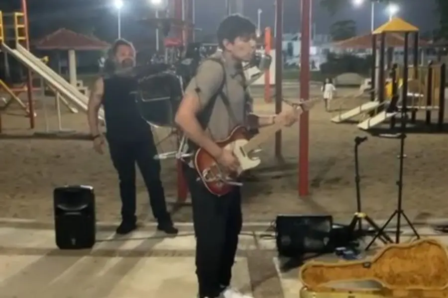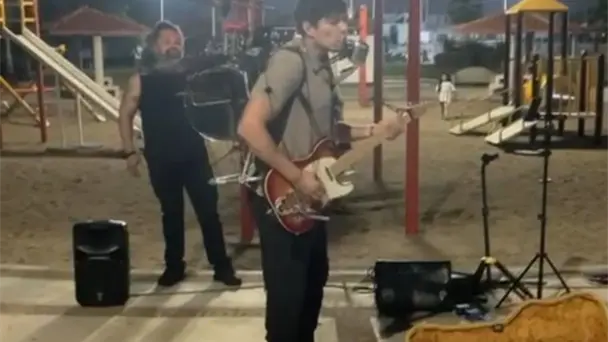 Por la tarde de este jueves, el sonido de los platillos y el bombo que carga sobre su espalda comenzó a sonar en el parque. El repertorio incluyó clásicos que fueron desde The Beatles hasta éxitos del rock urbano de El Tri, reuniendo rápidamente público.