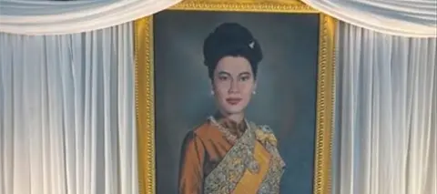 El santuario incluye un retrato enmarcado de la Reina Sirikit, flanqueado por arreglos florales blancos sobre pedestales dorados.