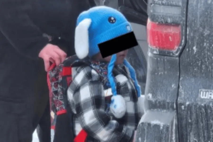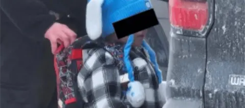 En redes sociales se observan fotografías de agentes del ICE guiando al niño a una camioneta, quien porta una mochila y un gorro azul, que asemeja a un animal.