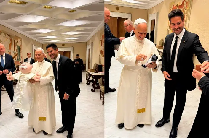 González Herrera compartió imágenes del momento en que el obispo de Roma recibió dos muñecos del Dr. Simi, uno caracterizado como Papa y otro ataviado con el uniforme de los Chicago White Sox, el equipo de béisbol favorito de León XIV.