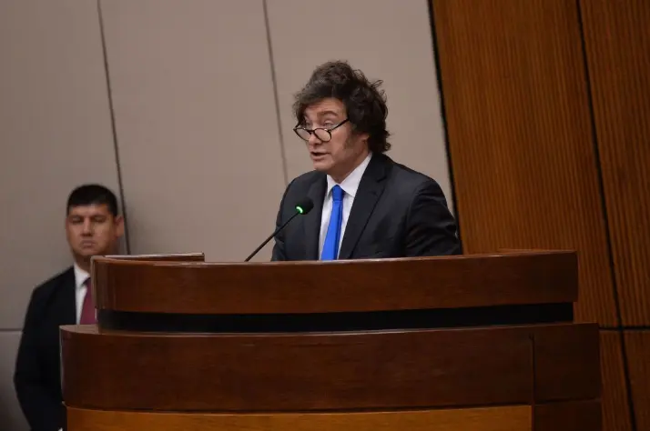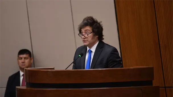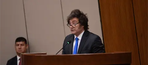 Hay "pánico político que se está espiralizando en el mercado y generando una descoordinación enorme en términos de riesgo país", dijo Javier Milei al disertar un discurso ante la Bolsa de Comercio de Córdoba.