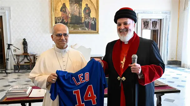 El dirigente de la Iglesia asiria obsequió al Jerarca católico, un jersey de los Chicago Cubs, equipo de beisbol al que le va Mar Awa III, mientras que León XIV, apoya a los White Sox.
