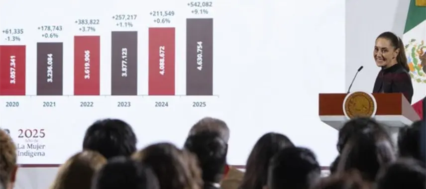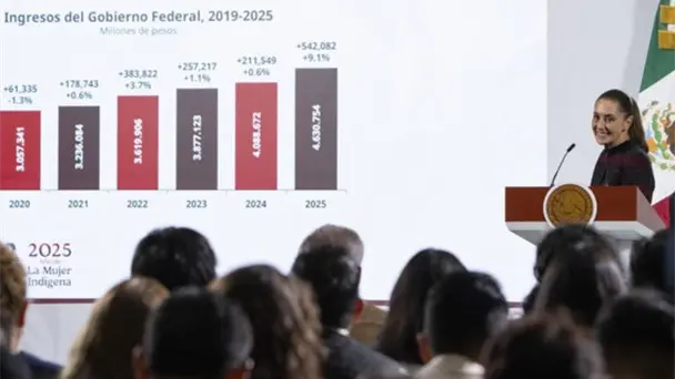 "La recaudación de impuestos alcanza cifras históricas, son poco más de 500 000 millones adicionales de ingresos este año, de los cuales cerca de 200 000 vienen de aduanas. En enero septiembre del 2019 la recaudación llegaba a los casi 3 billones. A septiembre de 2025 la recaudación es de 4.6 billones. Obviamente aquí pues hay una parte de inflación, pero, de todas maneras. Del 2024 al 2025 es 9.1% ese sí, en términos reales. Incluso descontando inflación. Así que un aplauso para el equipo de la secretaria de Hacienda. Y un aplauso más grande para todas las mexicanas y mexicanos", indicó.