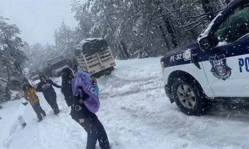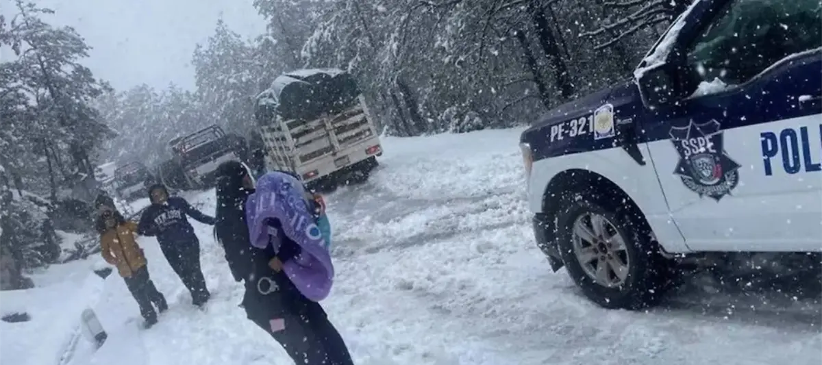 Los elementos de la Policía de Despliegue de la Secretaría de Seguridad Pública de Chihuahua salvaron de morir congelados a seis personas, cuatro mujeres y dos menores, que se habían quedado varadas por la acumulación de nieve en la carretera que conecta Parral con Guadalupe y Calvo.