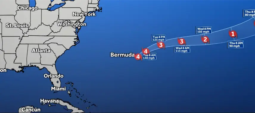 Asimismo, indicó que su vórtice se ubicaba a 290 kilómetros de distancia de las Bermudas y se movía hacia el nor-noreste a 19 km/h.