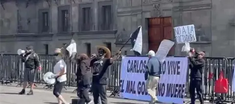 En redes sociales, un video muestra cómo uno de los manifestantes con una máscara negra y una bandera del mismo color, grita, "Fuera Bedolla", "Carlos Manzo vive, el mal gobierno muere", mientras era secundado por otros presentes.