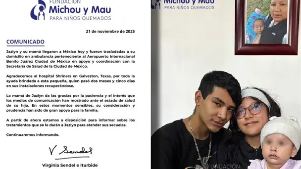 La fundación Michou y Mau logra el regreso de la niña Jazlyn Azulet a México después de sufrir quemaduras en un accidente con una pipa en Iztapalapa.