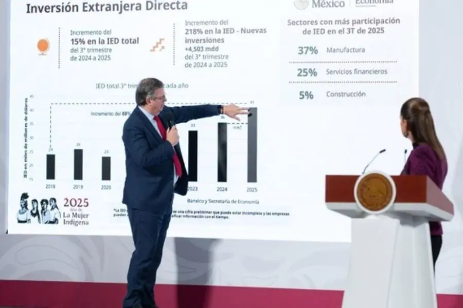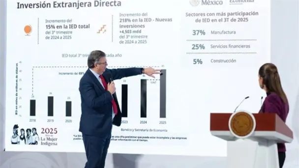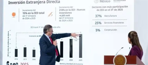 "Aumento de la inversión extranjera directa en México, vamos a alcanzar récord histórico este último trimestre de acuerdo al registro nacional de inversión extranjera, vamos a llegar casi a 41 mil millones de dólares. Si comparamos 41 mil millones de dólares, que es lo que llevamos este último trimestre, si lo comparamos con 2024, creció 15%. Todas las expectativas es que no tuviéramos un crecimiento de ese tamaño, quisiera yo detenerme un poco en esa primera noticia que es muy buena, para explicarles porque es tan importante, ¿Qué significa ese ritmo de inversión extranjera directa? Significa que los inversionistas de todo el mundo están decidiendo invertir por México en mayor proporción a la que habíamos, incluso, esperado, por eso es muy, muy buena noticia", destacó.