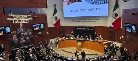 Durante la sesión de este miércoles en el Senado de la República, legisladores del Partido Revolucionario Institucional (PRI) colgaron una manta con el escrito, "El narco-gobierno que padece México. Integrantes del Cártel de Morena".