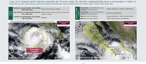 El meteoro presenta vientos máximos sostenidos de 120 km/h y se localiza a 470 kilómetros (km) al sur-suroeste de Cabo Corrientes, Jalisco, y a 780 km al sur-sureste de Cabo San Lucas, Baja California Sur.