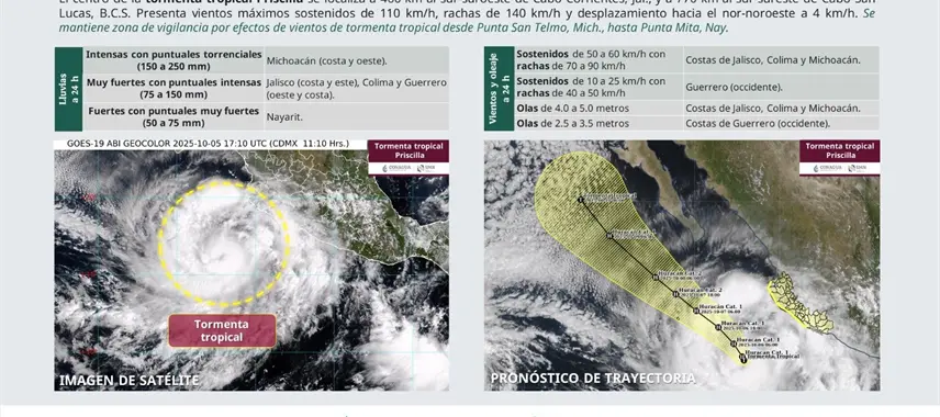 El fenómeno hidrometeorológico "Priscila" ya es huracán categoría 1, mientras avanza frente a las costas del Océano Pacífico, informó la Comisión Nacional del Agua (Conagua).