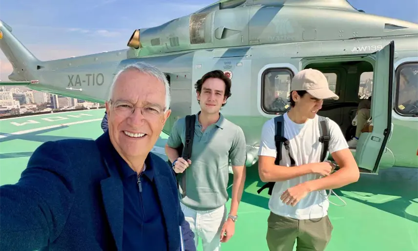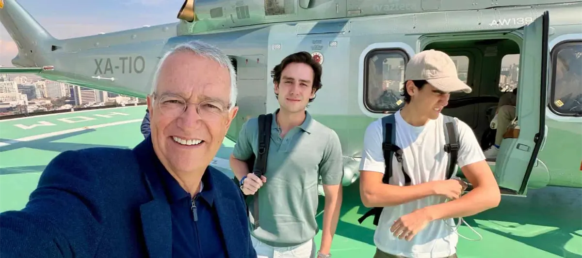 En la publicación, el empresario compartió dos fotografías en donde se puede apreciar su helicóptero y tres jóvenes -familiares de él- que lo acompañan en su viaje, uno de ellos en sillas de ruedas.