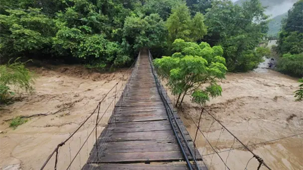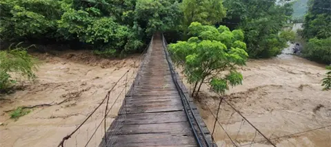 En Santo Domingo, una de las pocas comunidades de Jacala que cuenta con puente colgante, se observa el impetuoso paso del río convertido en fango, reflejo de la magnitud del desbordamiento.