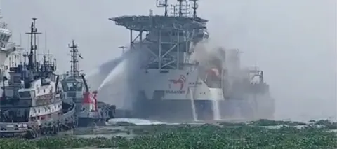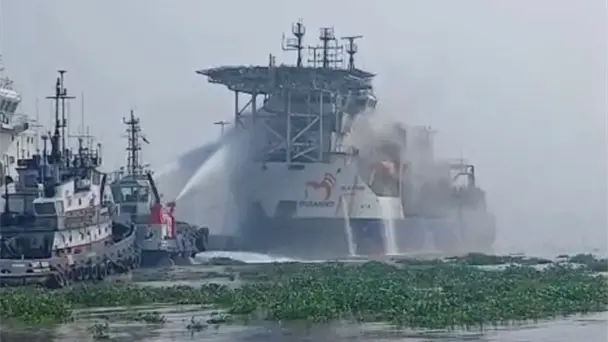Se incendia buque en puerto de Coatzacoalcos, Veracruz