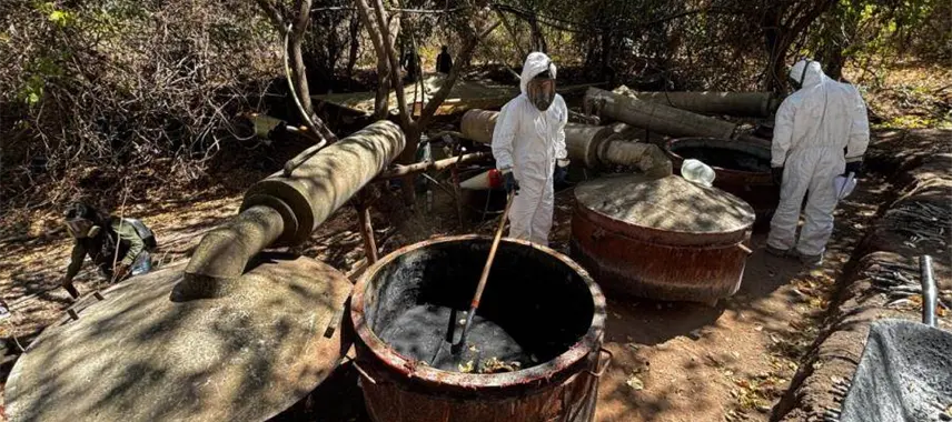 Por otro lado, elementos del Ejército, en un recorrido por los poblados del Zapote, Bartolo y Cabañas de Tacuichamona, aseguraron 660 litros de acetona, 100 litros de ácido clorhídrico, 25 kilos de sosa cáustica, 20 bidones, un tambo y seis tinacos.