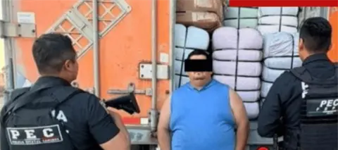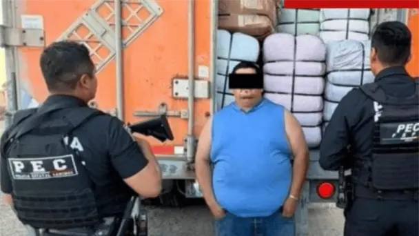 El tráiler Kenworth blanco modelo 2020 con placas de circulación de Estados Unidos, era conducido por Christian "N" de 37 años y al interior se hallaron 255 pacas de ropa, calzado y bolsas.