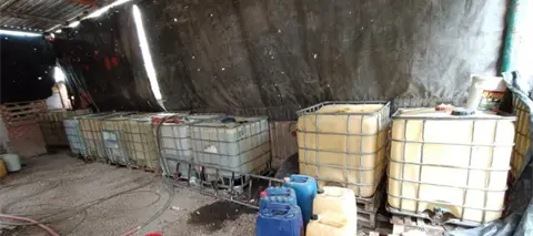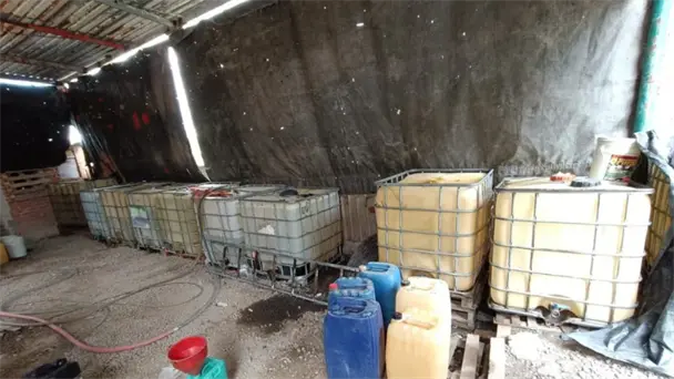 En el sitio, delimitado con tarimas y un zaguán metálico negro, se encontraron bidones de mil litros con hidrocarburo, así como un vehículo marca International color blanco con rojo, modificado con una cisterna artesanal en su área de carga.