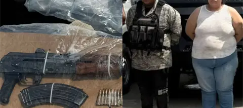 De igual forma se confiscó un arma larga tipo fusil AK-47, calibre 762x39 mm, con un cargador metálico y 8 cartuchos útiles, y también se aseguró un vehículo marca Nissan Versa, color azul, sin placas.