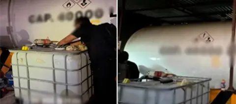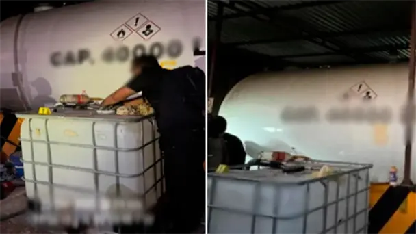 Durante el cateo de un inmueble, las autoridades también aseguraron una bolsa con mariguana, un tanque, 26 contenedores de diversos tamaños, dos cubitanques, dos garrafas y cuatro tambos.