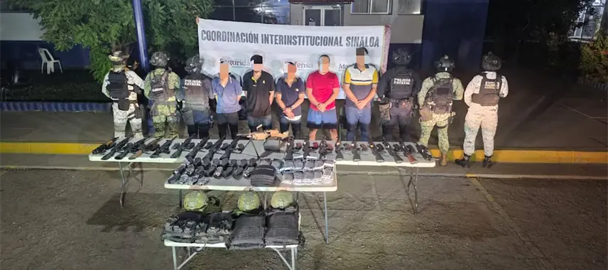 A través de un comunicado, la Secretaría de la Defensa Nacional (Defensa) informó que, en el fraccionamiento Cataluña, municipio de Culiacán, realizaron la detención de cinco sujetos y aseguraron 1 ametralladora minimi calibre 5.56 mm; 20 armas de fuego largas; 77 cargadores; 1,515 cartuchos; 25 artefactos explosivos improvisados; equipo táctico; 2 vehículos y 1 inmueble.