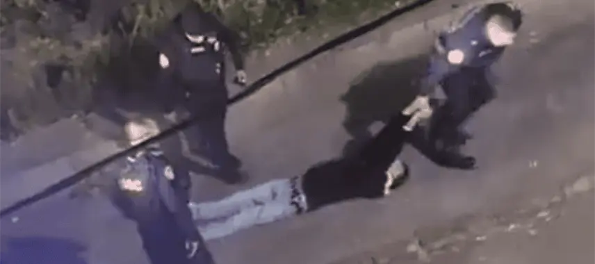 Luego de unos minutos, uno de los elementos arrastra al hombre hasta la patrulla.