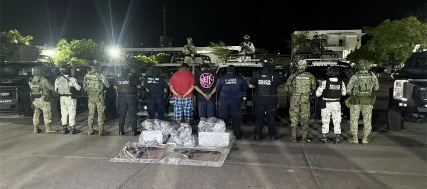 La Fuerza Interinstitucional de Reacción Táctica (FIRT) Olmeca detuvo a dos presuntos distribuidores de drogas en la ranchería Reyes Hernández segunda sección, en el municipio de Comalcalco.