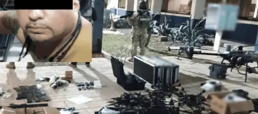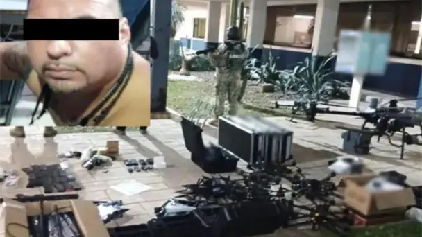 Entre el arsenal asegurado se encuentran 18 drones, 151 artefactos explosivos diseñados para acoplarse a los drones, dos dispositivos explosivos improvisados, 44 cartuchos, 26 cargadores, tres sistemas antidrones y dos armas de fuego.