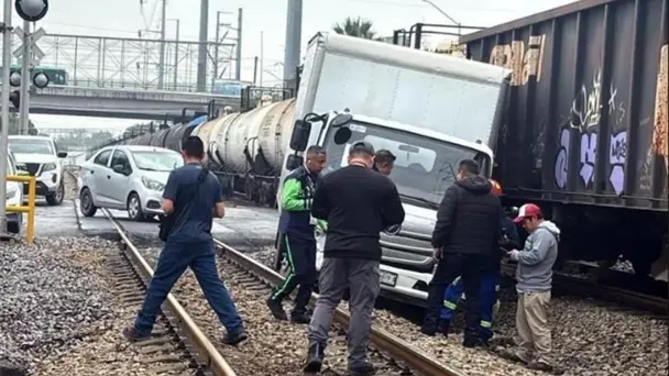 Un camión de carga fue impactado por un tren al intentar ganarle el paso en San Nicolás de los Garza, Nuevo León, alrededor del mediodía de este miércoles.