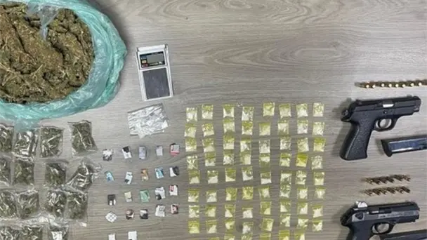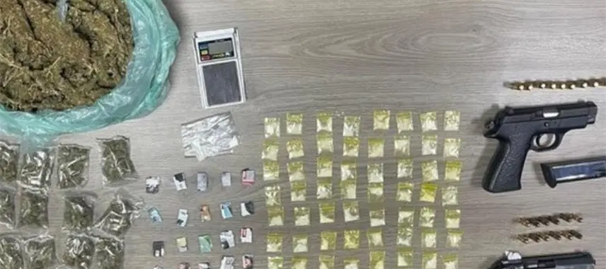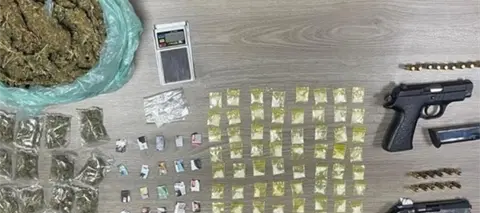 Le aseguraron un arma de fuego con su respectivo cargador, 14 cartuchos útiles sin contar con el permiso para su portación y 47 bolsitas de diversas cantidades de marihuana, así como de la droga conocida como cristal (metanfetamina).