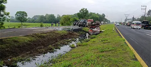 La madrugada de este domingo se volcó una pipa en la carretera Villahermosa-Cárdenas, a la altura del kilómetro 137, frente a la comunidad Mario Barrueta García, de Cunduacán.