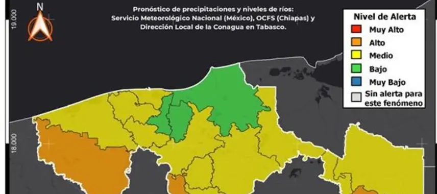 Asimismo, advirtió la probabilidad de desbordamientos y vados carreteros en las riberas de los ríos Pichucalco y de la Sierra; además, en menor medida podrían presentarse sobre el río Teapa y Oxolotán.