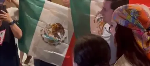 El emotivo momento erizó la piel de los espectadores, pues los mexicanos y tabasqueños entonaron "Cielito Lindo" ondeando la bandera nacional y pancartas con frases de apoyo a Miss Universe México 2025.