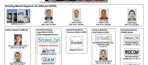 En un comunicado se precisa, que las personas sancionadas son los hermanos Víctor Andrés, Francisco, Jorge Luis y María Gabriela Favela López, así como el esposo de ésta, Jairo Verdugo Araujo, y Gilberto Gallardo García, que está casado con otra hermana de los Favela López.