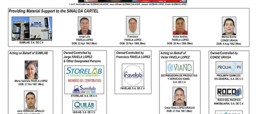 Otras empresas sancionadas y que pertenecen a la familia Favela López son: Agrolaren, S.P.R. de R.L. de C.V. (Agrolaren), Distribuidora de Productores y Servicios Viand, S.A. de C.V. (Viand), Favelab, S.A. de C.V. (Favelab), Favela Pro, S.A. de C.V. (d.b.a. Fagalab), Qui Lab, S.A. de C.V. (Qui Lab) y Storelab, S.A. de C.V. (Storelab).