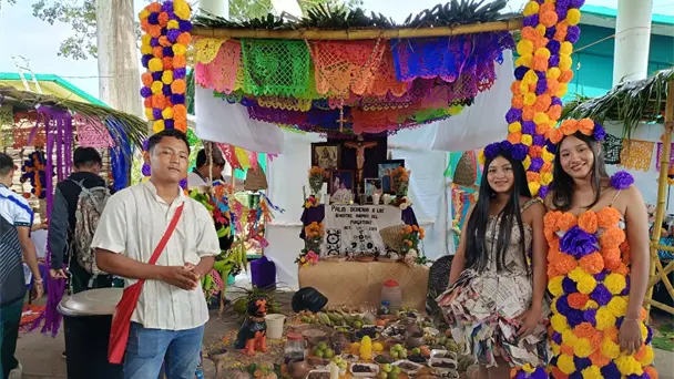 "Lo más común que se está ofreciendo es lo tradicional, lo que degustaban los vivos, tenemos los alimentos, los panes de día de muertos, frutas, el tradicional uso de la flor del cempasúchil que representa la luz y el camino por donde transitan nuestros seres queridos que ya fallecieron. También el uso de la sal y los escalones que representa cada uno de los niveles que se quiere recordar en el Día de Muertos", explicó Miguel Ángel Marín Montejo, director de la institución.