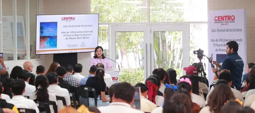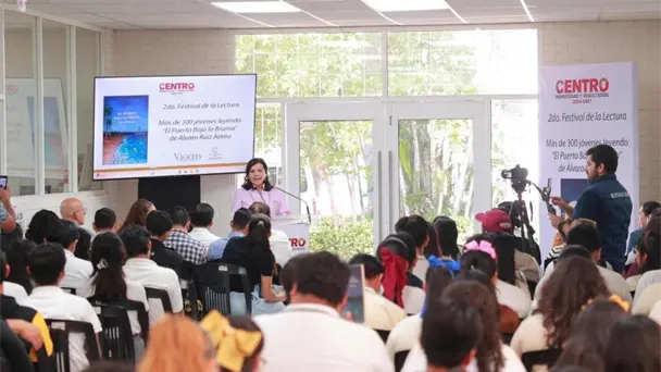 En este evento, participaron más de 300 jóvenes, entre estudiantes y deportistas, leyendo de manera simultánea la obra "El puerto bajo la bruma", del tabasqueño Álvaro Ruiz Abreu, reeditada por el Fondo Editorial de Centro.