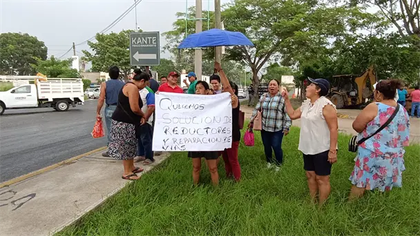 Habitantes del Ejido José María Pino Suárez, de Centro protestaron en la vía Periférico, a la altura de la entrada al Cedro, para exigir la colocación de reductores en la zona y la reparación de la calle en la margen izquierda del río Carrizal.