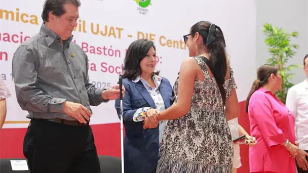 En el marco de la conmemoración del Día Internacional del Bastón Blanco, el ayuntamiento de Centro entregó 21 bastones de apoyo a integrantes de la comunidad universitaria de la UJAT con discapacidad visual.