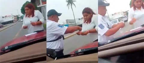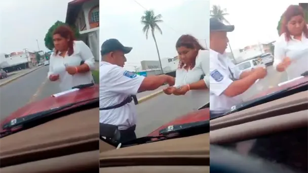 En el video grabado por el conductor desde el interior de su vehículo, se observa que la mujer realiza el cobro de la infracción y con una impresora portátil imprime un recibo y entrega el comprobante del pago, junto con el cambio a una mujer que acompaña al conductor.
