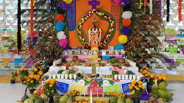 "El altar mestizo consta de tres pisos que simbolizan, el primero, la tierra, el segundo, piso el purgatorio y el tercero, el cielo. Así como elementos importantes que no deben faltar en un altar mestizo como lo son el agua para calmar la sed de las almas después del camino recorrido. La sal para purificar, se cree que limpia el alma y cuerpo del difunto para que pueda transitar de forma segura. La flor de cempasúchil, tierra, que marca el camino que va a seguir el alma", se explicó.