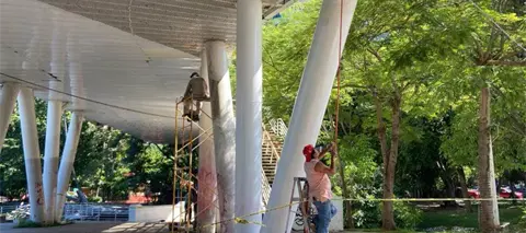 Este jueves, se pudo observar a personal llevando a cabo labores de raspado y pintura del Musevi del lado del Foro Laguna, Parque Tomás Garrido.