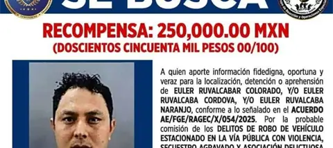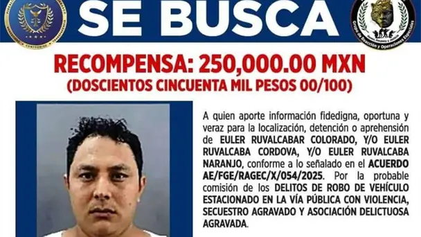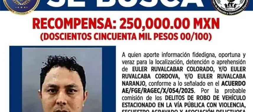 La Fiscalía General de Tabasco ofreció una recompensa a la persona que aporte datos que ayuden a la detención de Euler Ruvalcabar Colorado y/o Euler Rubalcaba Córdova, y/o Euler Rubalcaba Naranjo.