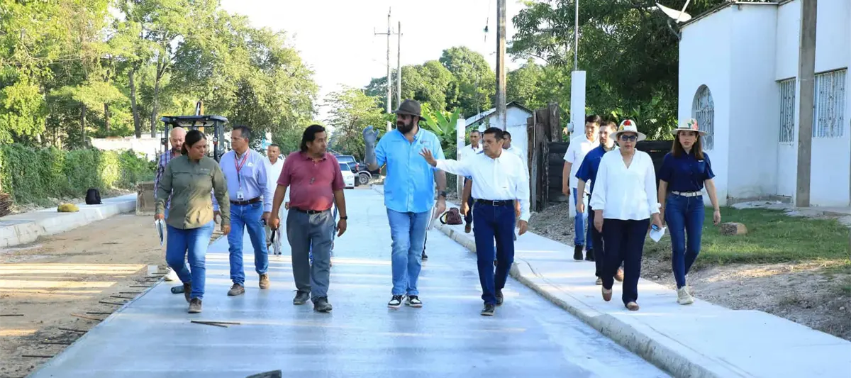 El gobernador Javier May Rodríguez supervisó este sábado la construcción de calles con concreto hidráulico en Villa El Triunfo, Balancán, obras en las dijo, se realiza una inversión de 17.5 millones de pesos.