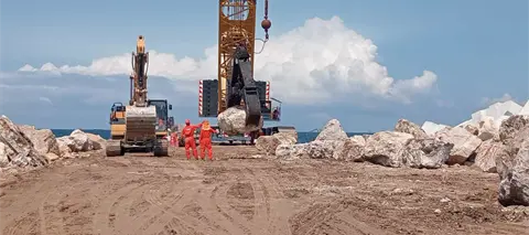 Esta obra de protección a cargo de la Secretaría de Marina (Semar) se encuentra en su etapa final y en total contempla dos mil 500 metros de escolleras oriente y poniente.