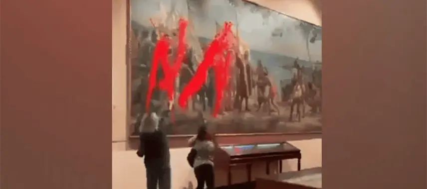 En el marco del Día de la Raza y Aniversario del Descubrimiento de América, dos activistas arrojaron pintura roja sobre un cuadro de Cristóbal Colón, del artista José Santiago Garnelo, expuesto en el Museo Naval de Madrid, en España.