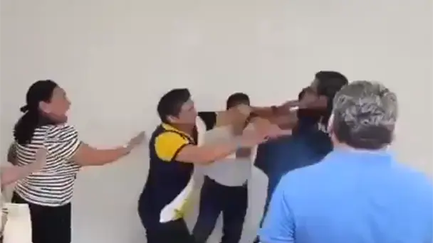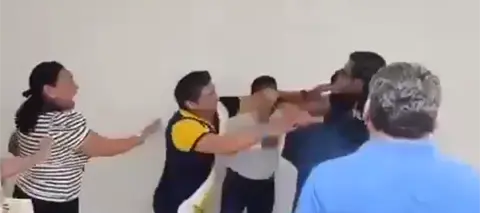 Los reclamos verbales escalaron a empujones y golpes, mientras que algunos militantes lanzaban sillas en medio del tumulto, por lo que varios de los presentes en el evento tuvieron que intervenir para frenar la confrontación.
