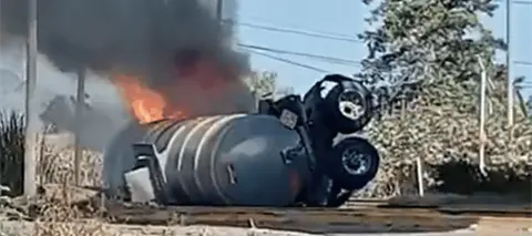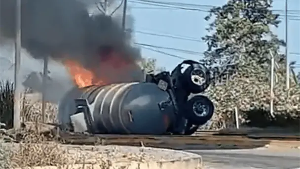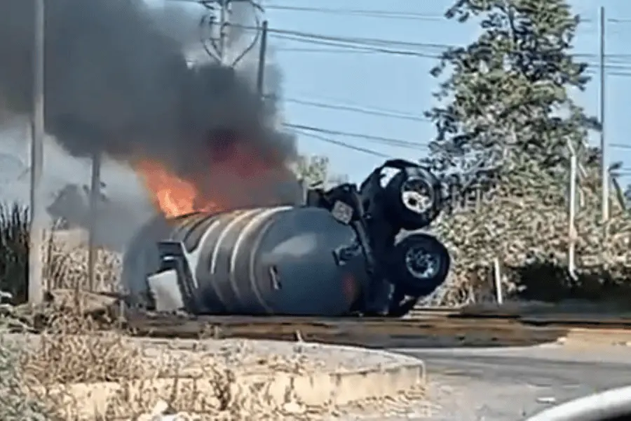 De acuerdo con los primeros reportes, la pipa intentó ganarle el paso a la locomotora, por lo que el fuerte impacto causó un incendió, que generó una enorme columna de humo.