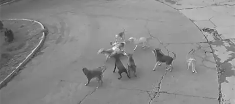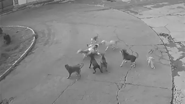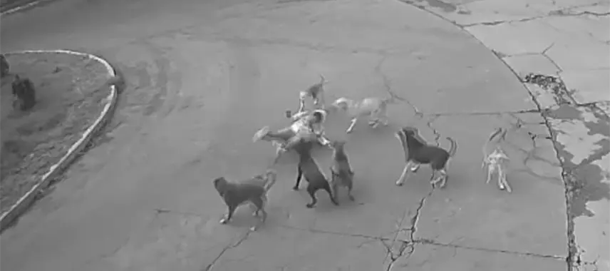 Una cámara de seguridad captó el momento en el que un par de canes comienzan a ladrarle y seguirla, enseguida comienzan a morderla, hasta que la tiran al suelo.