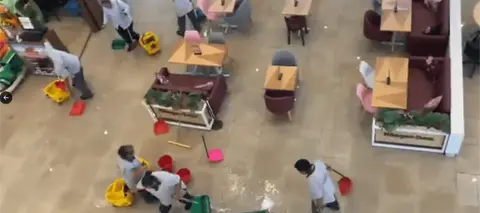 De inmediato personal de los establecimientos y de la plaza comenzaron a escurrir y recoger el agua en esa zona, la cual estuvo cerrada por un par de horas.